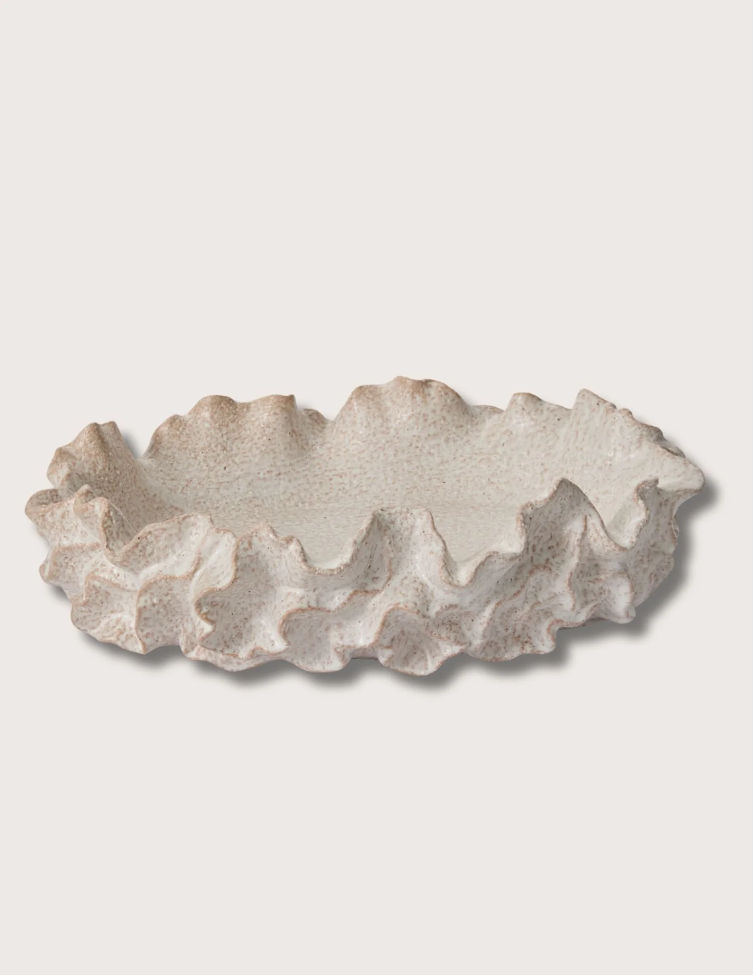 Experience the textural wonder of the large-scale Coral Ceramic Serving Bowl. This shallow oblong bowl features an organic ruffled exterior and slightly sandy tone and surface. Display on its own, or feature as a dynamic accent piece.