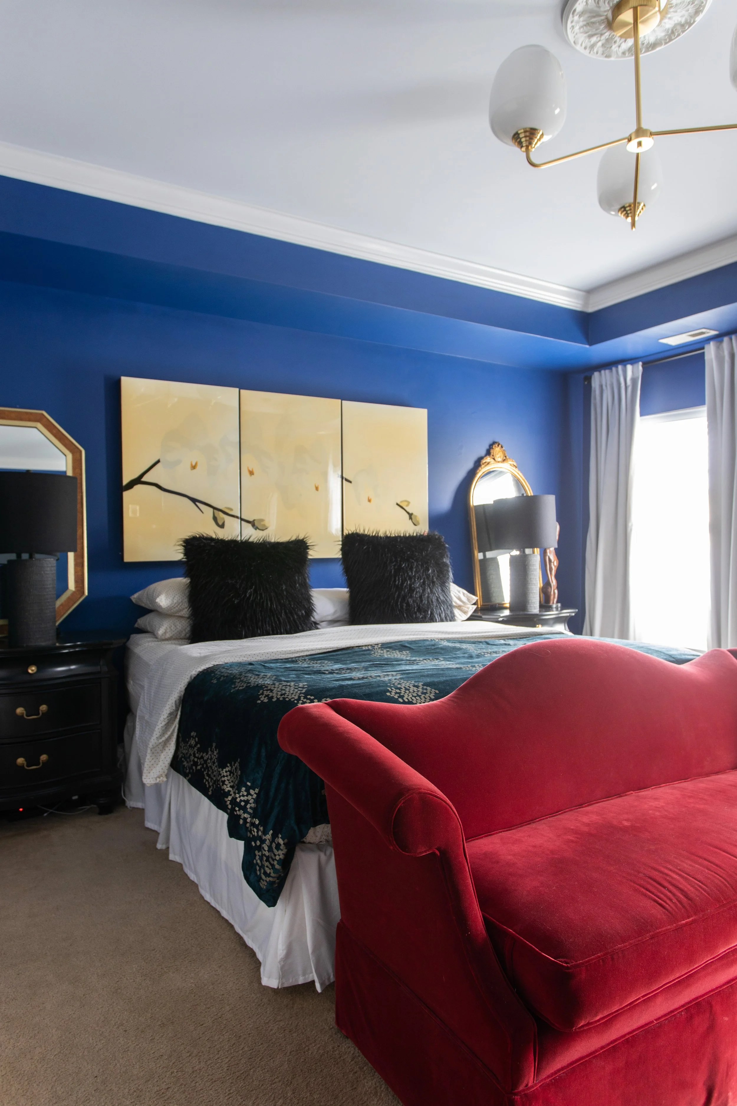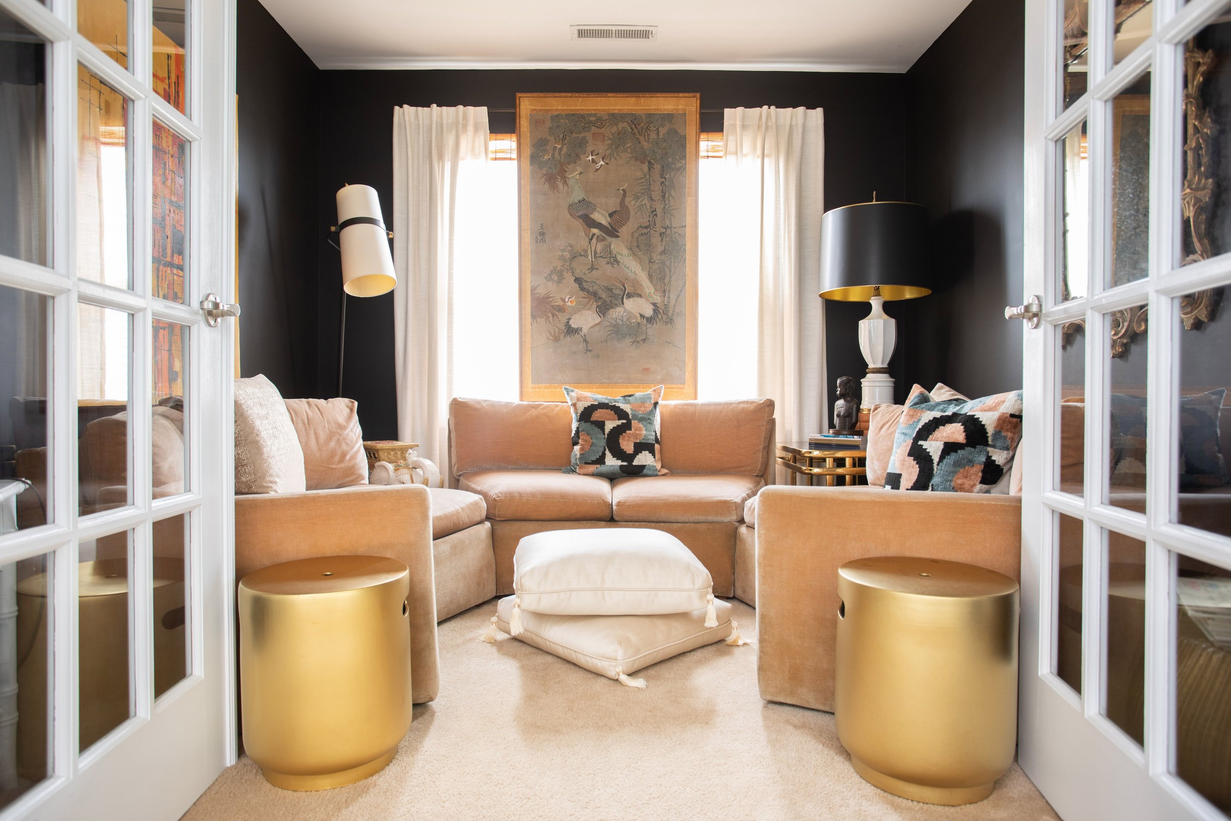 At the top of the stairs, twin doors open on a small parlor space dominated by large paintings and beautiful velvet furniture. The furniture belonged to Ariene’s mother, and remains in the same perfect condition that it was when purchased in the 1960s. “I get my love of design from my mom,” Ariene reflects. “She taught me to buy once and buy well.”