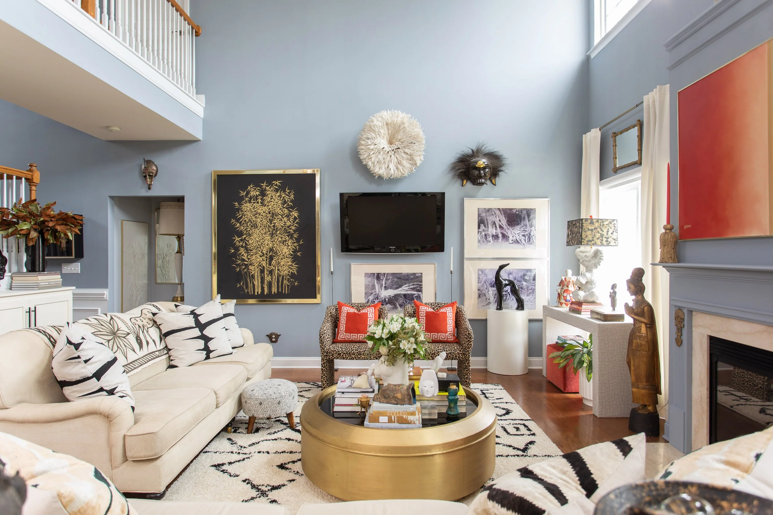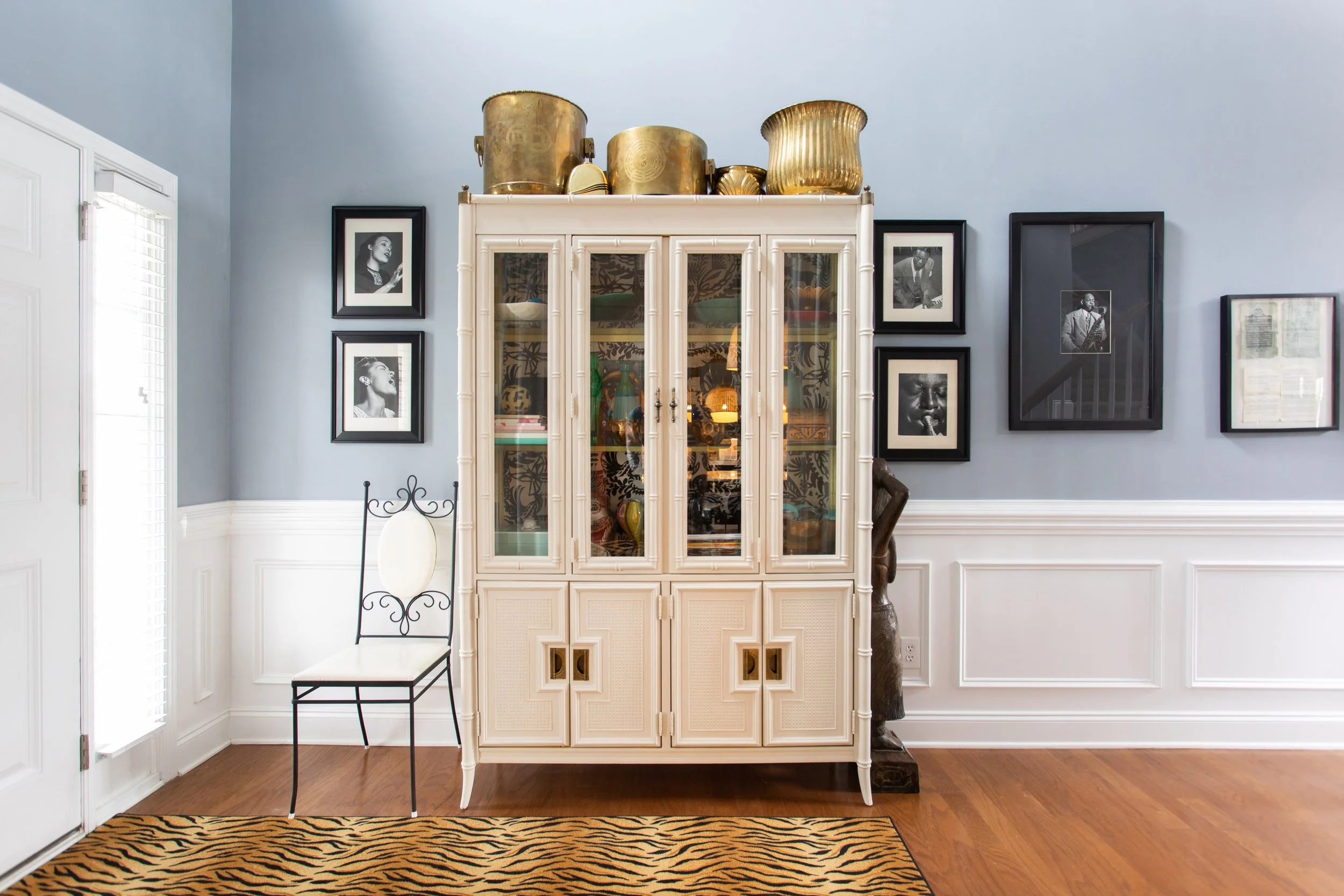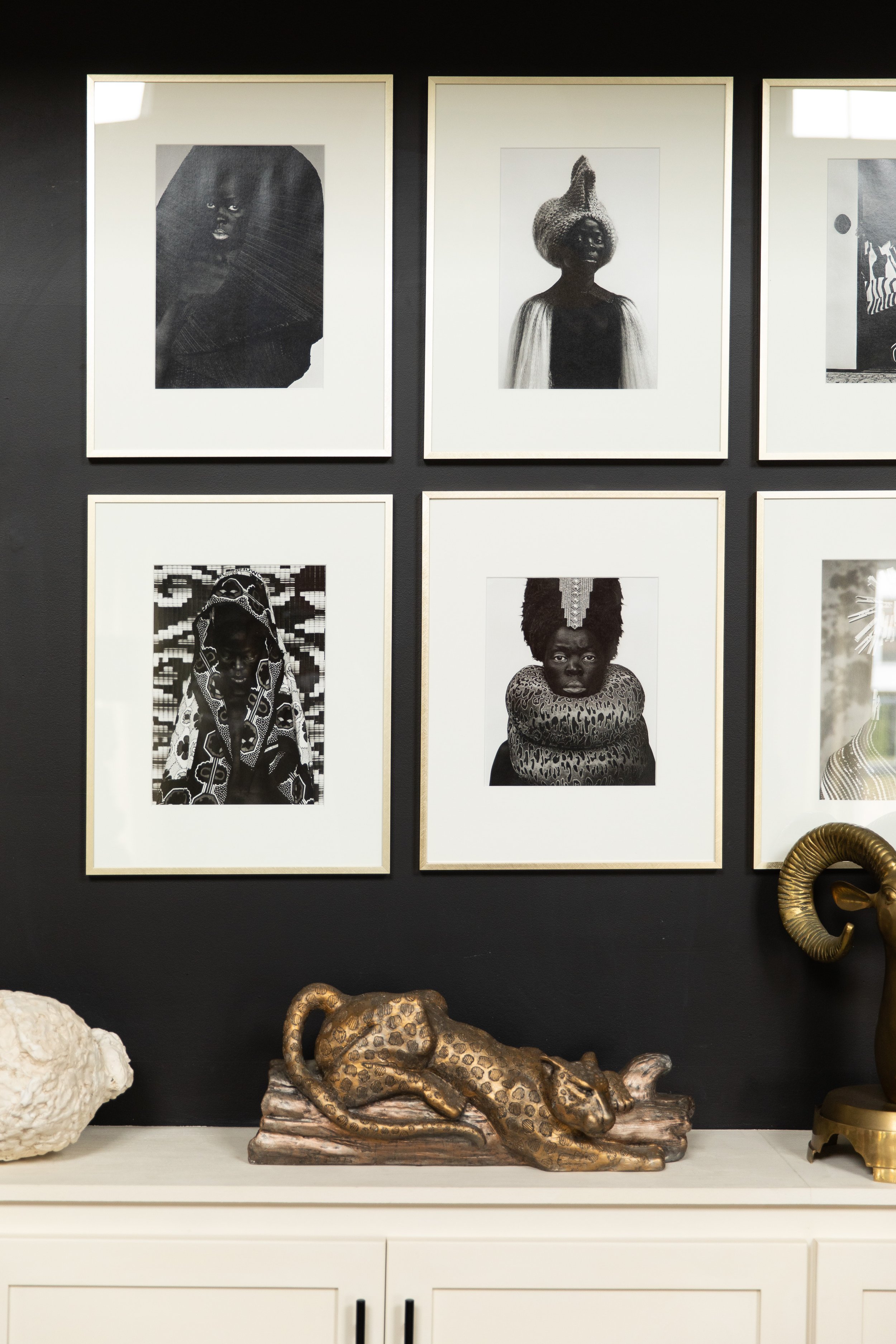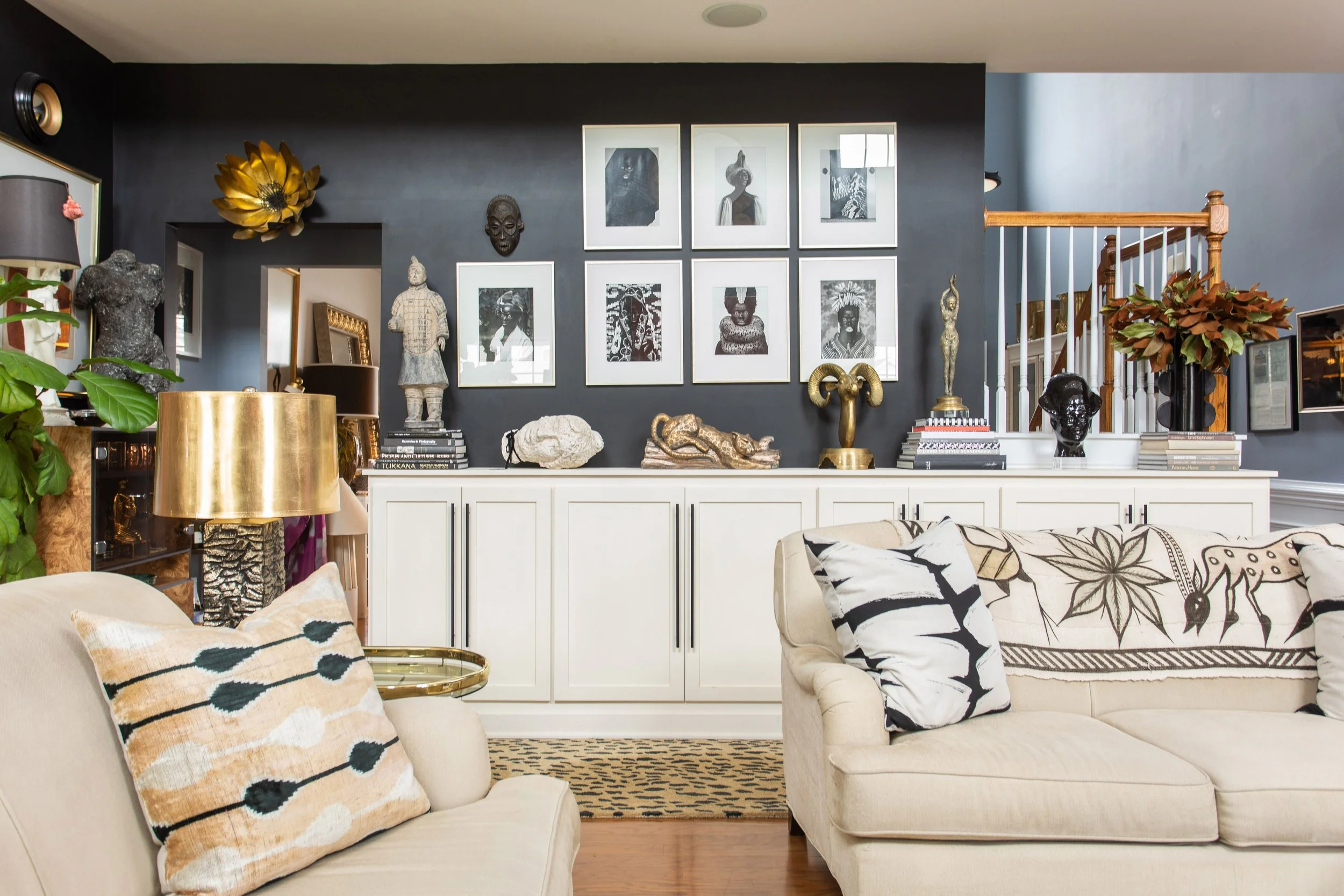 One of Ariene’s tricks for creating balance within her multi-layered design aesthetic is to create subtle connections between those layers. The pattern of the leopard statue is echoed in several of the photos that hang above it. The same can be said for the pieces to either side of it. Small connections like these help the eye to move smoothly from one piece to another, allowing visitors to take it all in as a single coherent moment rather than as a collection of disparate parts.