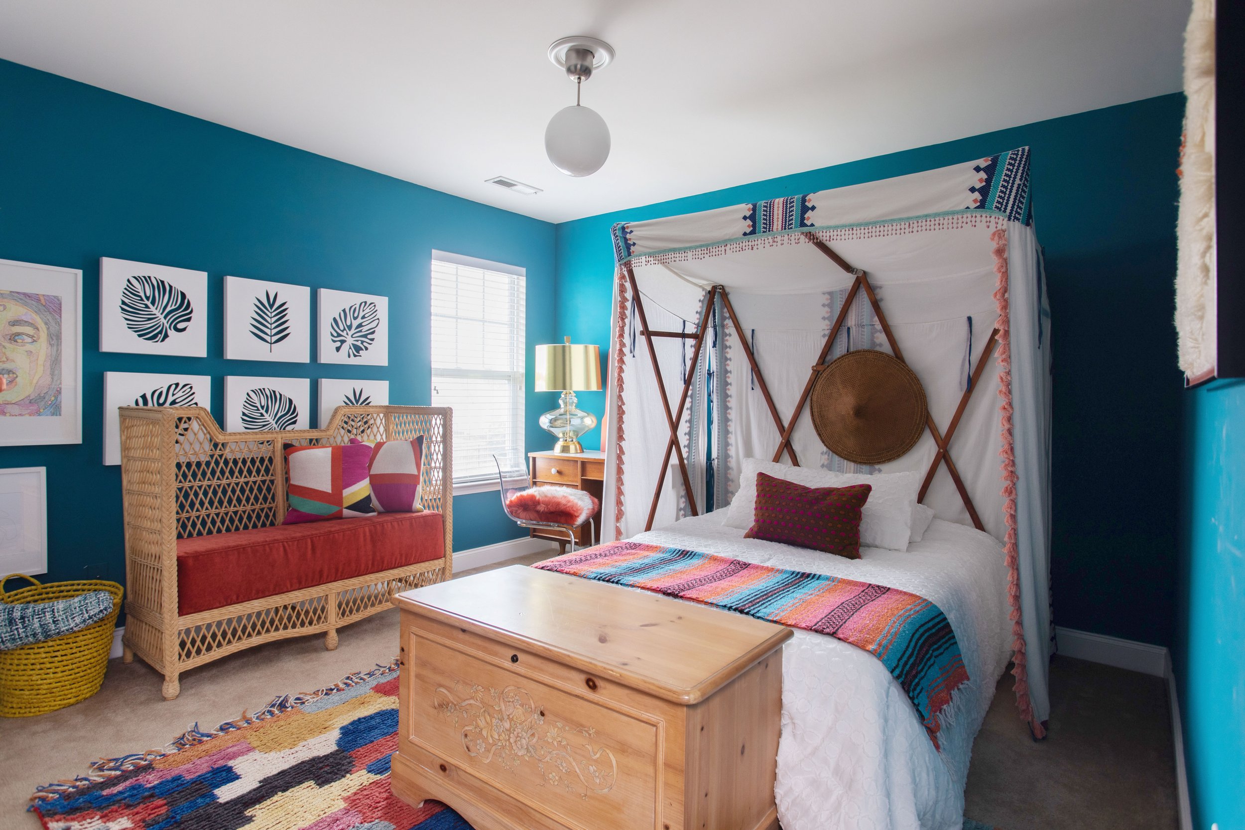 Guest rooms are often catchalls for things that don’t quite go with the rest of the house. However, Ariene has succeeded in designing her guest suite to be a full-on retreat for anyone staying with her. The blue walls, sand-colored carpet and wood furnishings create an island feel that’s supported by the palm leaf art and canopy bed. Colorful textiles throughout the space keep the color palette lively and add to the tropical aesthetic.