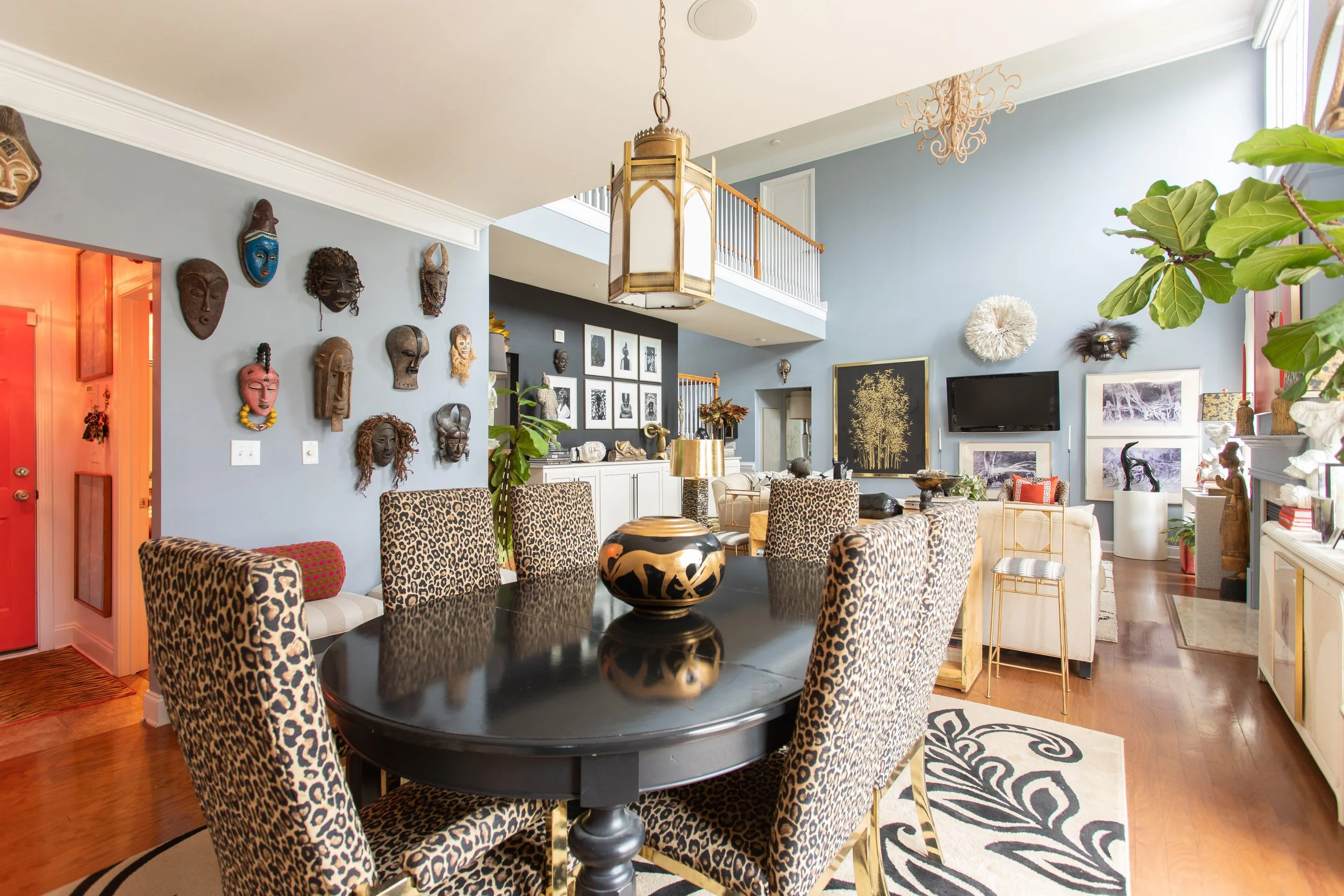 Ariene continues to demonstrate her fearless dedication to pattern with a complete set of leopard-print chairs around the dining table. As always she blends them seamlessly into the overall decor of the home by creating connections all throughout the open plan living-dining room space. Color connections can be seen as far away as the brass-framed artwork on the living room wall, and as far up as the chandelier over the living area. Thematically, the chairs are echoed by the leopard-themed vase that sits on the dining room table.