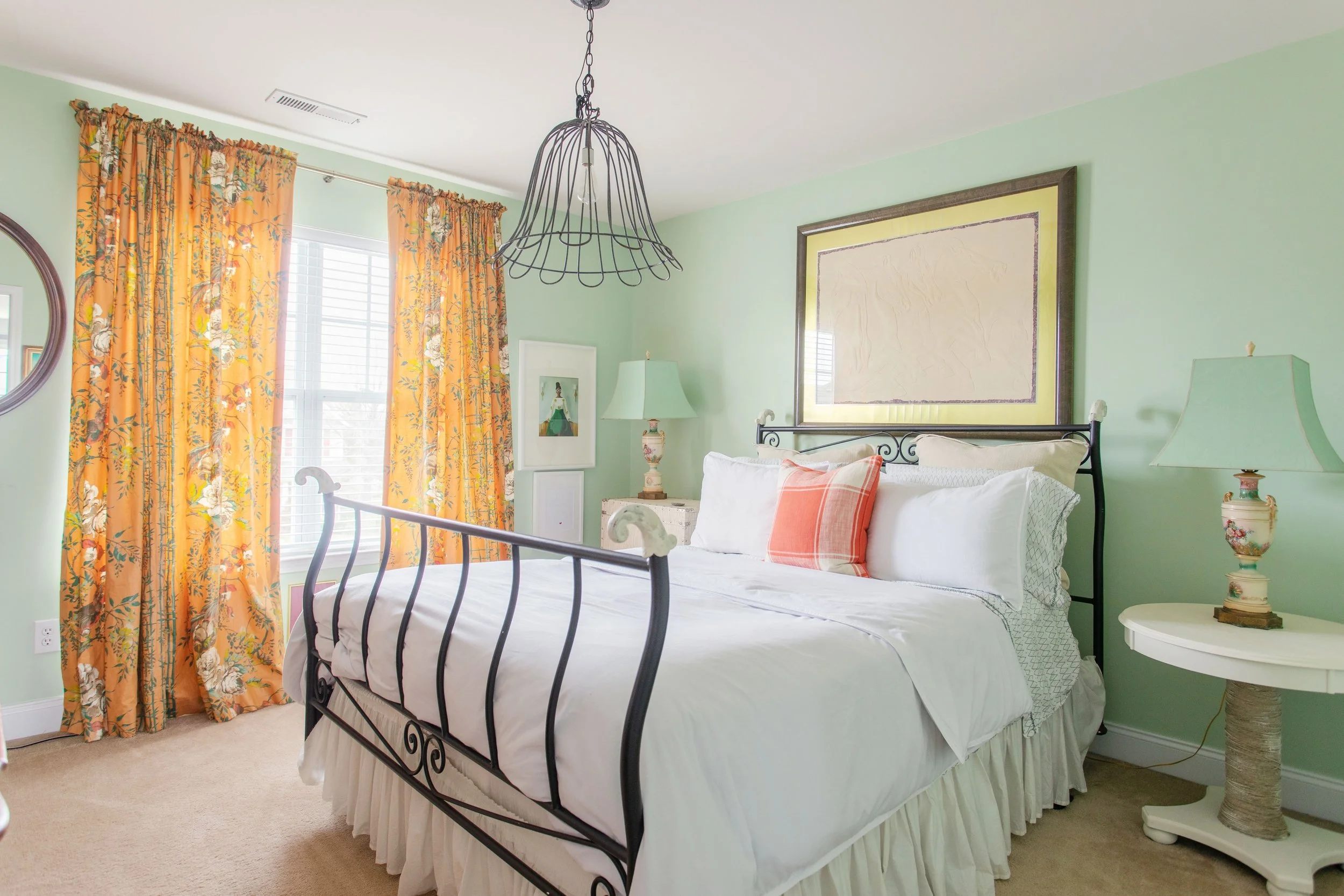 The second guest bedroom offers a restful aesthetic of a different sort. The pastel walls and bright orange floral curtains give the space a whimsical feel. It’s a calmer side of the home’s decor, evoking a seaside cottage rather than a beachside resort. For Ariene, creating different looks is part of the fun. The constant search for the perfect piece is what keeps her on the move. “I own a vintage shop so I’m always traveling and picking up things,” she says.