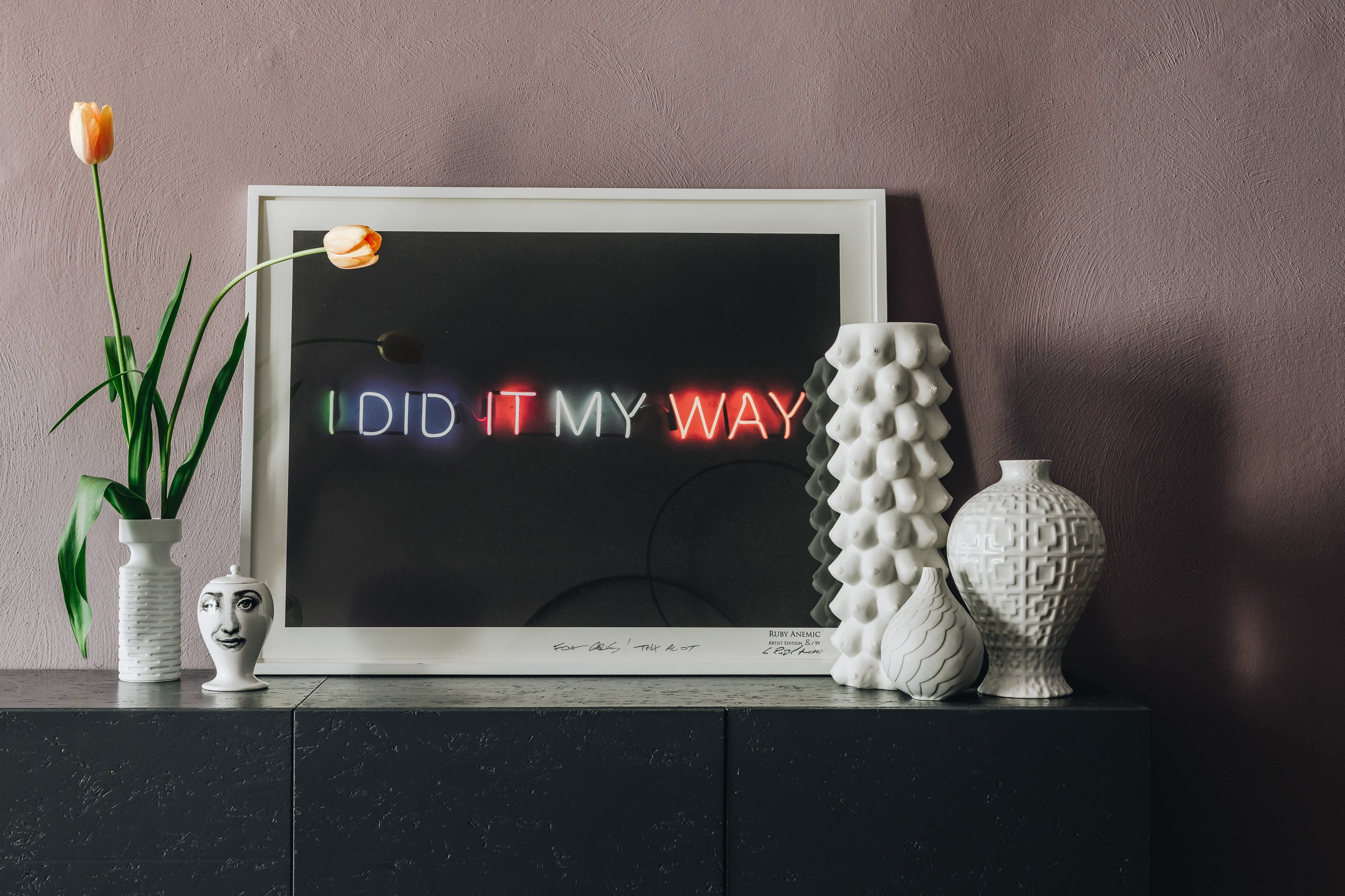 Further on, the hallway becomes a sort of art gallery, showcasing the fruits of a passion that began as a child. “When I was young, my mother collected art and I always thought of it as something beautiful, but unattainable,” Chris remembers. “Today I appreciate that the works I have are for me. They are personal mementos.”
