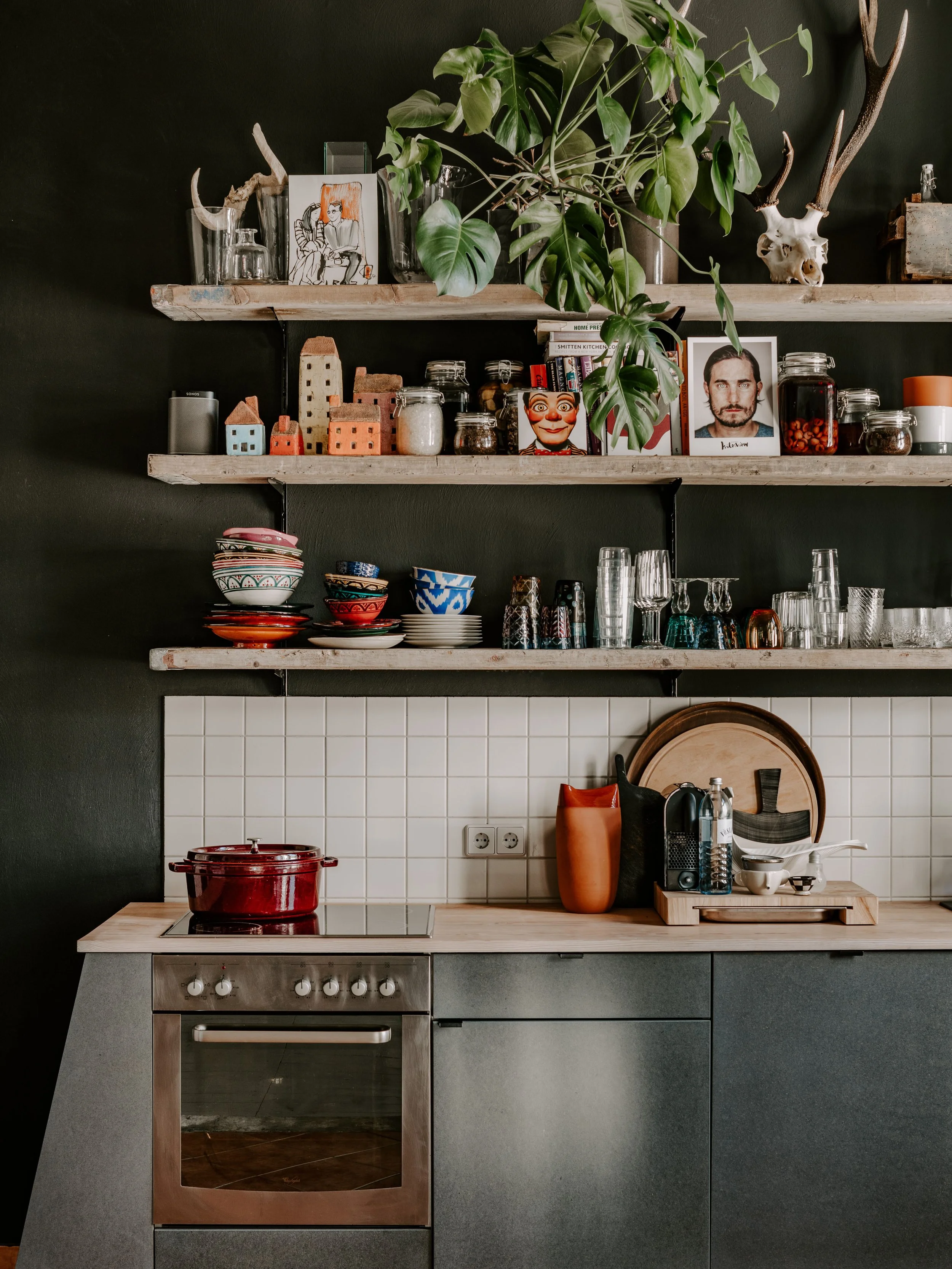 During the renovation process, the kitchen was one of the major points of focus. To begin with, he opened the wall separating the space from the living room. “The kitchen was a tiny box and the space needed more light,” he says. From there, some cabinets were removed, while others had their facades changed; shelves and storage were built and appliances were added and rearranged. “This was a big chunk of work, but it made a world of difference.” The finished space received a full treatment of Chris’ bohemian aesthetic, with shelves adorned with clay miniature houses as well as glasses, plants and food containers.