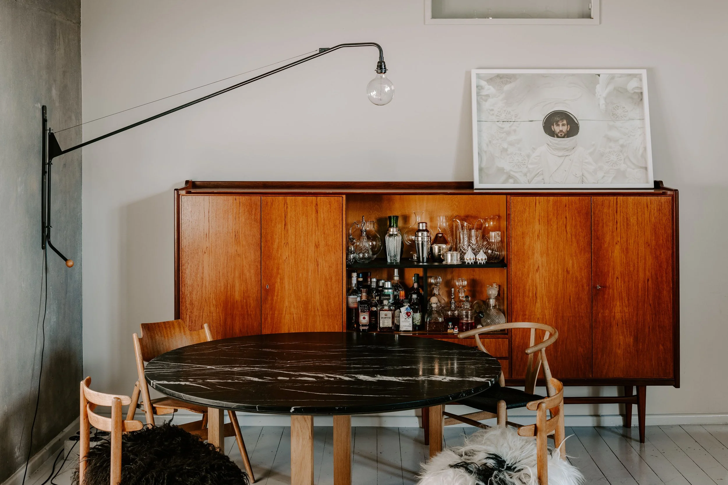 The dining room is a fluid continuation of the living room’s aesthetic, mixing warm wood tones with the cooler shades of the walls, art and tabletop. The intriguing interplay of wood, stone and fur that characterizes this space reveals another point about Chris’ design aesthetic. “I like to make bold choices in interiors and I’m fond of color and texture,” he admits. “But it’s still important that the space feels warm and, more than anything, functional.”