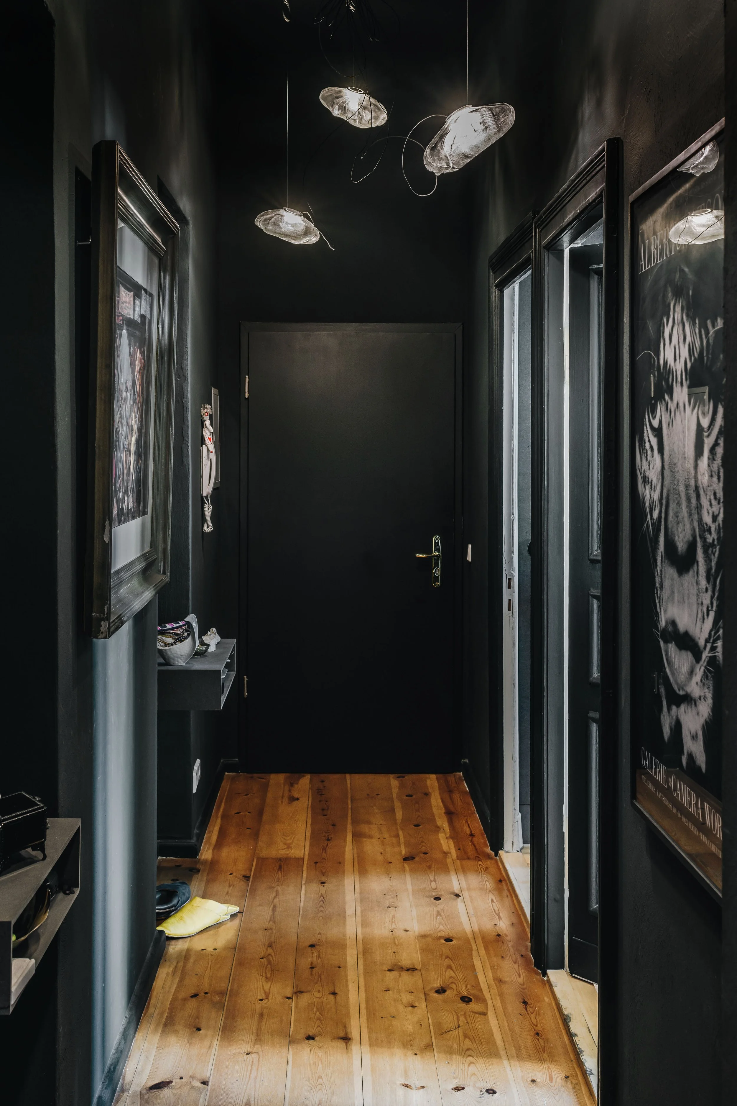 Though Chris’ use of color tends towards the subtle in his rooms, in the hall the tone changes, becoming bold, moody and captivating. “I literally painted everything I could,” he says about the redesign, noting that paint was an ideal way to rapidly change the look of the home. “I did the lion’s share of the work very early on because it was important to me to create a nest as quickly as possible,” he states. Covering the space in deep green - verging on black - the dark tone becomes a neutral, providing a perfect backdrop for the artwork and assorted tchotchkes that dot the walls.