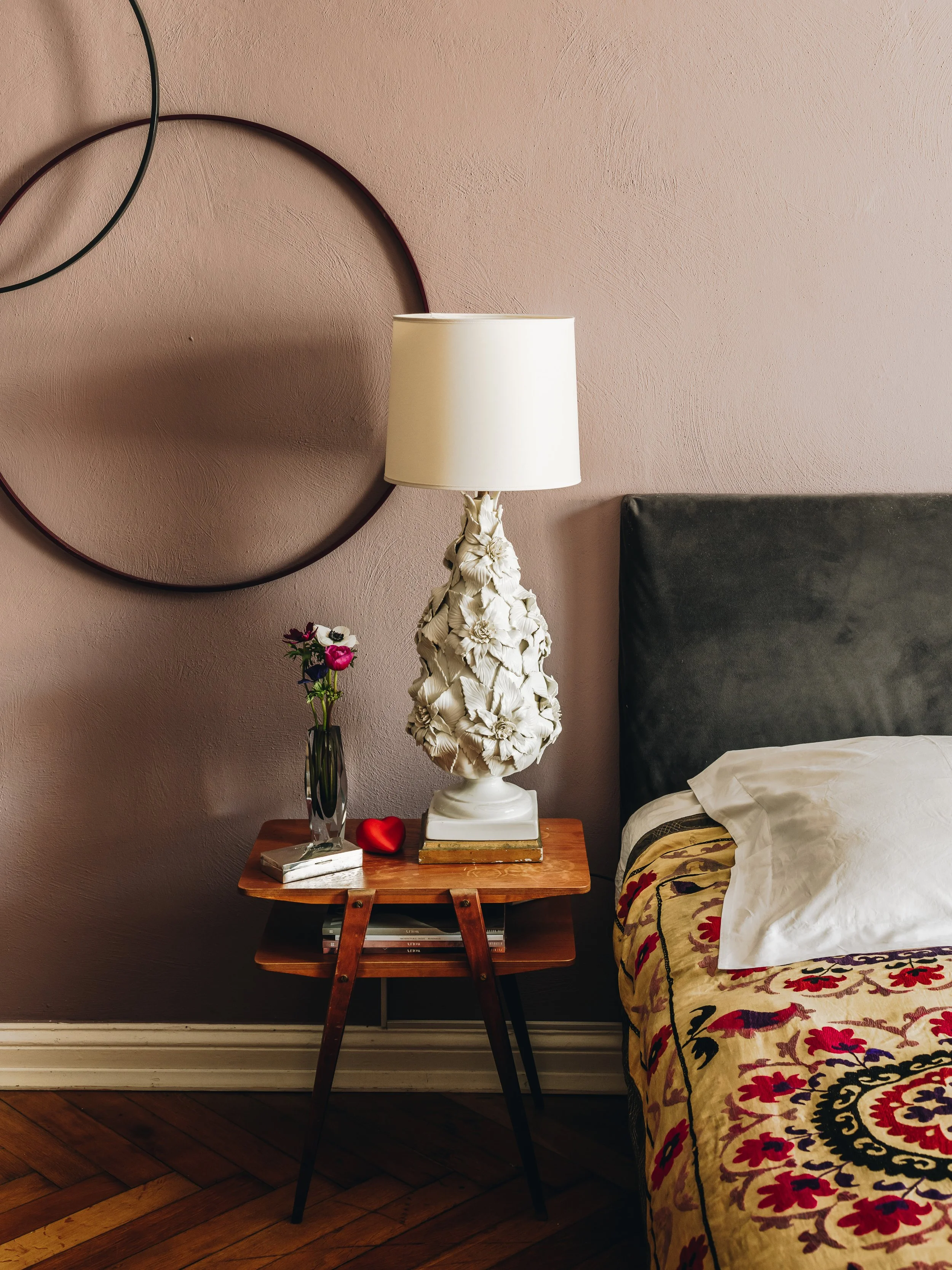 Another part of the relaxing feel of the bedroom comes from the fact that it is a far more minimalist space than some of Chris’ other rooms. Absent here are the overflowing bookshelves or rows of wall art that give such life and energy to the rest of the home. In this room they’re replaced by open spaces, engaging colors and simple pieces like the overlapping circles that hang on the wall next to the bed. The almost zen simplicity of the art contrasts the intricate design of the table lamp to land the room in a space that isn’t too busy or too boring, but just right.