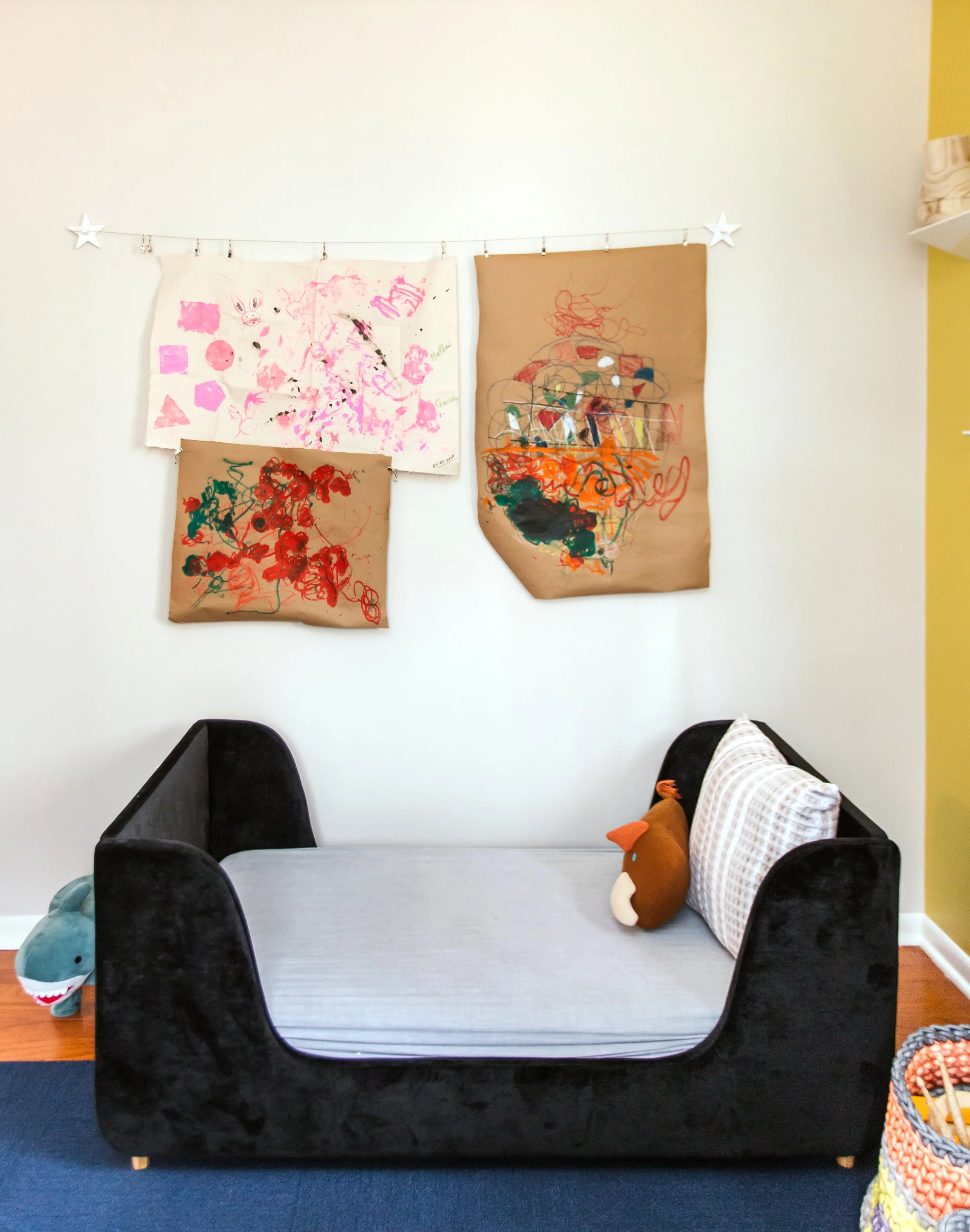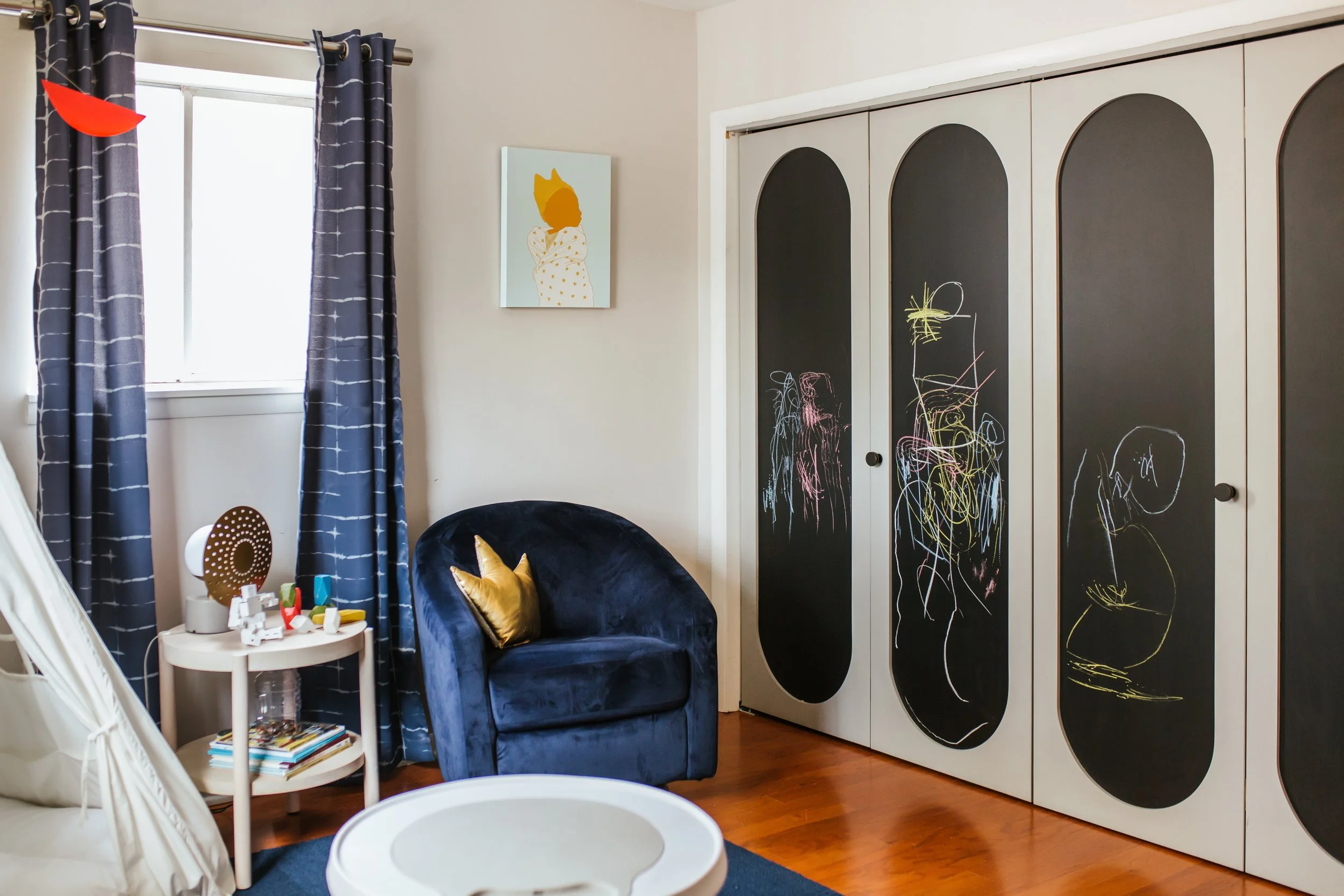 Nicole and Adrian weren’t Naïka’s only clients for this project. The couple’s son, Garvey had his own design needs. “Garvey’s bedroom was the easiest space to design in this home,” Naïka confides. “I designed his nursery years prior and the previous design organically morphed into a big boy room.” Following in his dad’s footsteps, the room comes with space for the budding artist to display his latest work. “I added chalkboard insets to his doors. He can create there every day and his parents can leave him inspirational notes.”