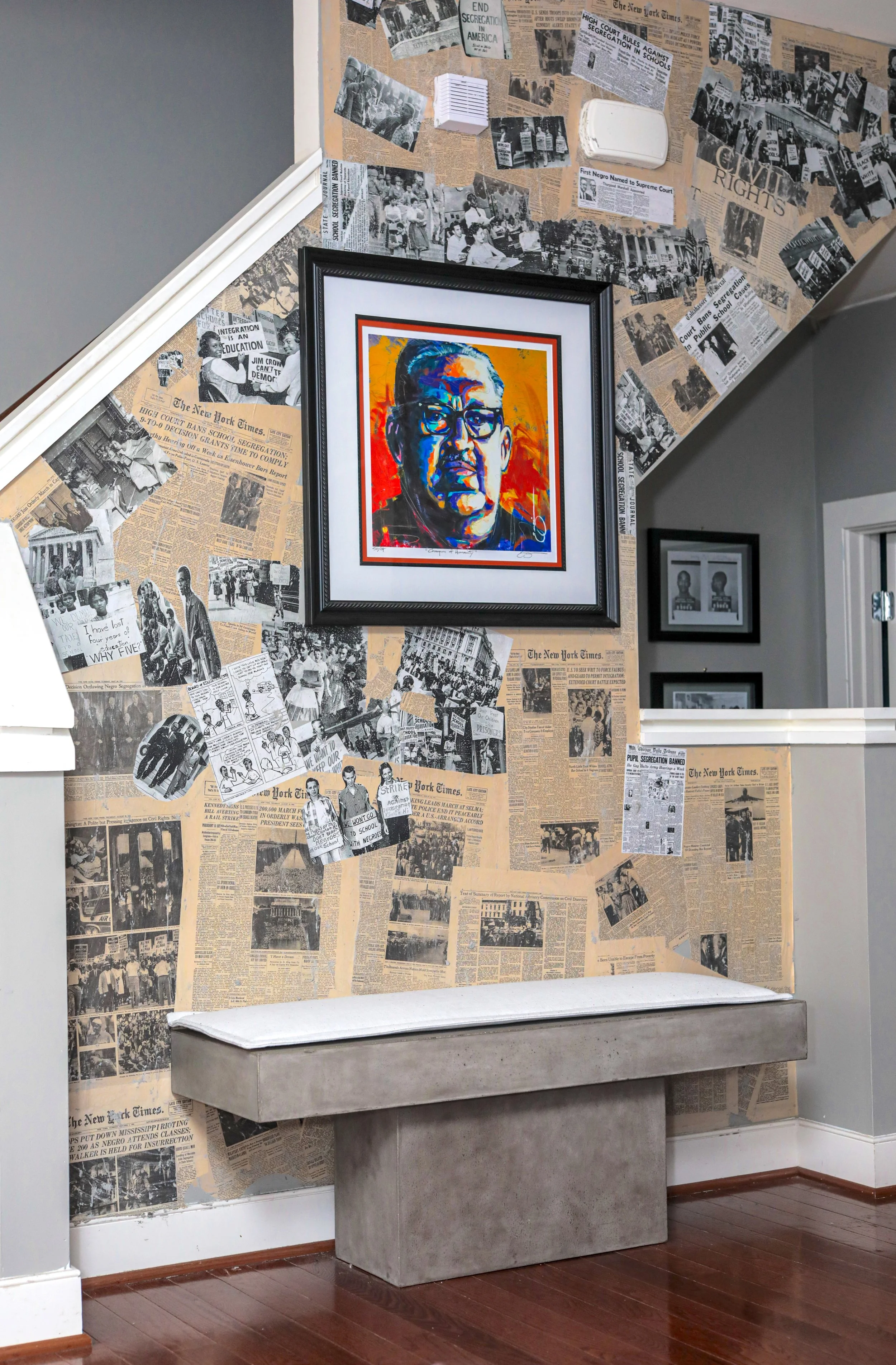 In the hallway landing a feature wall commemorating the landmark Brown v. The Board of Education Supreme Court decision is one of Rachel’s favorite aspects of the whole house. Rachel’s collage wall is a pastiche of moments surrounding the integration of American schools. Her clippings profile the March on Washington, examples of resistance to school integration and even political cartoons outlining the arguments for change. The papier-mâché of historic events is a backdrop to a colorful portrait of Thurgood Marshall. “This space is so important to me,” remarks Rachel. “I have dedicated my whole life to educating Black and Brown children and I wanted a space in my home that spoke to my passion.”