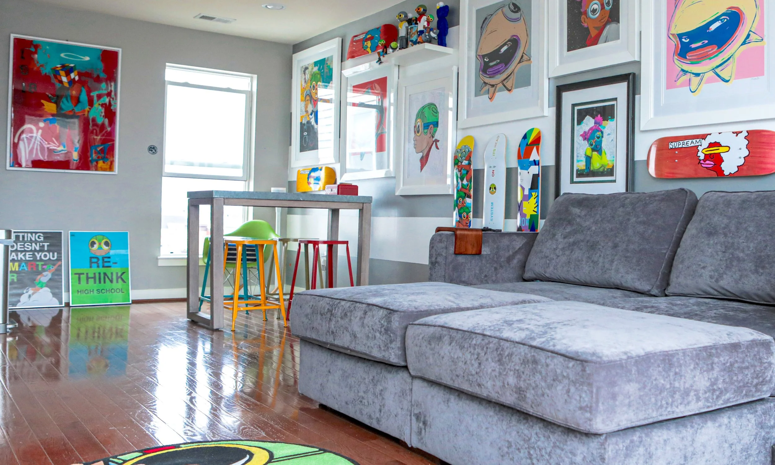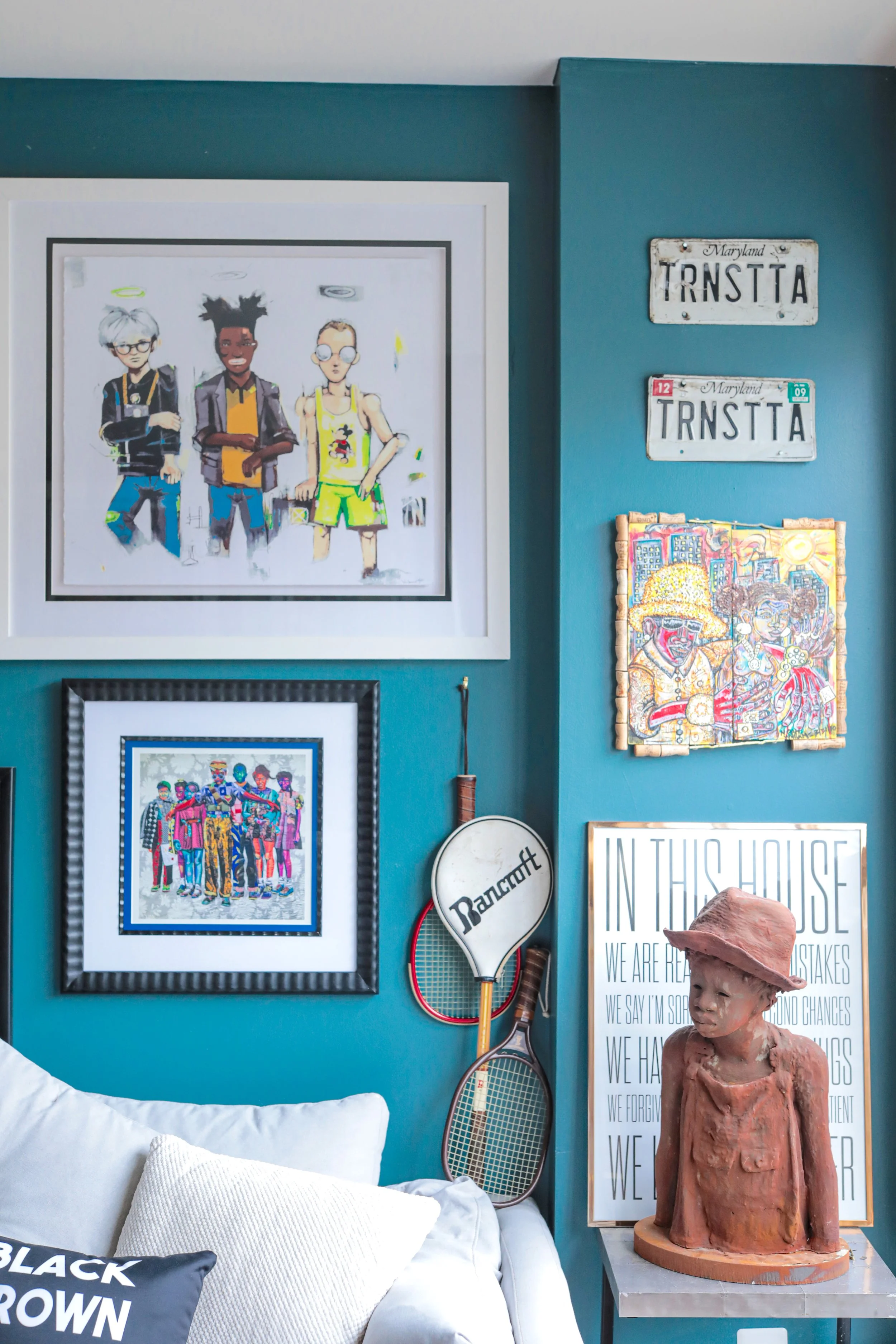 As one might expect from an artist’s home, Rachel has many favorites among her collection. These range from a painting by famed artist Elizabeth Catlett to a yarn blanket that she inherited from her mother. But when asked about her favorite room in her home, Rachel’s immediate answer is, “the fourth floor.” Calling it her “getaway,” she calls upon the childlike themes — the toys and skateboards on the walls and the collection of artwork by Hebru Brantley– as reasons why this room is her favorite space.