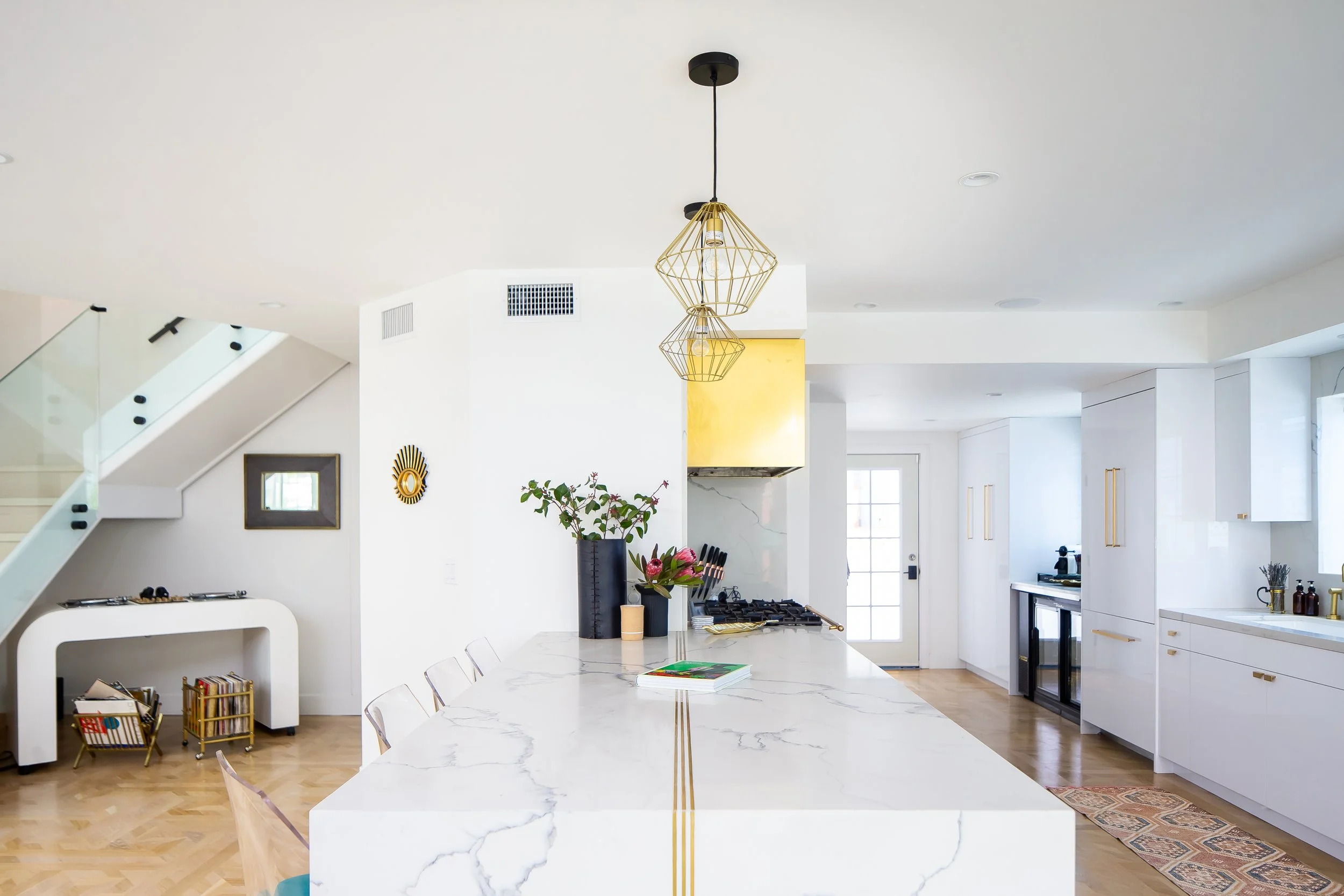 “It was a complete gut remodel,” Breegan remarks about the work of transitioning the home from the condition it was in when she first purchased it to where it is today. But the upside of such a monumental task is the beauty of having exactly what you want once it’s all over. In the main bathroom that means a vanity fit for a palace, featuring custom made mirrors and wrap-around marble counters along with Moroccan lighting.