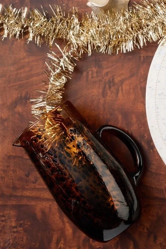 Crafted from hand blown glass with stylish speckles that mirror tortoise shell, our Baldwin Pitcher is perfect for serving your favorite drinks. Made from durable hand blown glass, this pitcher is a handcrafted work of art for your tablescape.