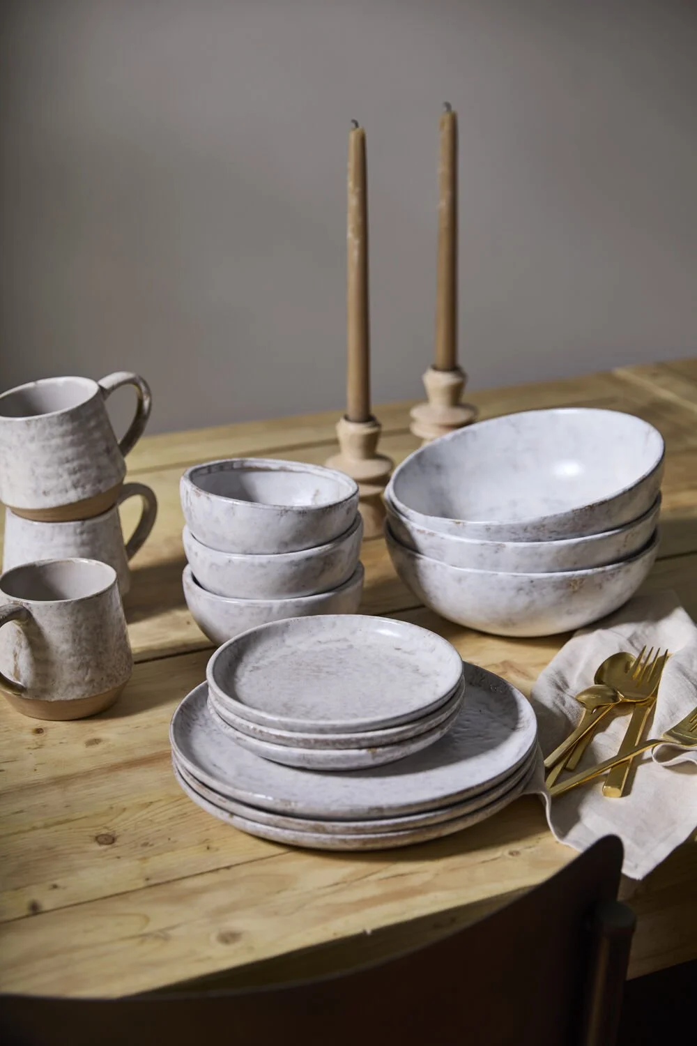 Our Buna Cloud Terracotta Mug features an organic white reactive glaze with grey and tan undertones, and a natural bisque ring at the base. The natural bisque base brings a nice textural and color contrast while pulling out the warm undertones of the full collection. Bring home the full Buna Dinnerware Collection for a coordinated look.